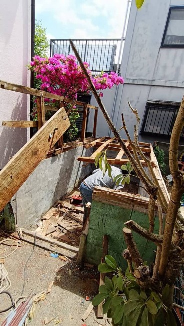 屋根・壁を撤去し、骨組みが露わに。庭のツツジが満開の中での作業でした。